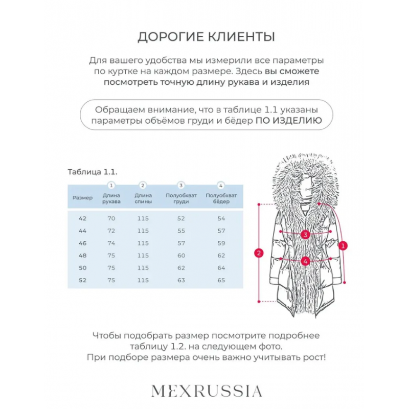Люксовый пуховик с глубоким капюшоном и натуральным мехом енота по периметру – новый тренд зимней коллекции 2024 - 2025. Такая эффектная модель премиум-класса должна быть у каждой девушки. Капюшон и съемная меховая опушка - прекрасно согревает голову и придает образу роскошь. Женская элитная куртка прямого кроя созданный для тех, кто ценит безупречный стиль и непревзойденный комфорт. Ткань с водонепроницаемым и ветрозащитным покрытием имеет неоднородный стильный оттенок. Специальная пропитка защищает от влаги и грязи. Дизайнерский модный оверсайз (oversize) можно носить в свободном варианте или приталить с помощью кулисок - поможет подчеркнуть талию и создать утонченный образ. Натуральный утиный пух невероятно легкий и теплый, сохраняет комфорт даже при температуре -30 градусов. Парка имеет удобные вместительные карманы и широкие длинные рукава. Есть два вида застегивания: мехом наружу и мехом во внутрь. Надежная стальная фурнитура в виде молнии и кнопок - детали, которые подчеркивают качество и премиальность. Чтобы правильно подобрать размер изделия, советуем использовать таблицу в карусели фото. ОБРАТИТЕ ВНИМАНИЕ! После получения изделия - обработайте внешнюю часть и мех отпаривателем. Мех причешите чесалкой для животных или обычной массажной расчёской. При расчесывании будет выходить лишний подпушек, он есть у всех новых меховых изделий (спустя несколько недель он полностью уйдёт). Длина по спинке 115 см. Удлиненный фасон - до колен, надежно защищает от холода и ветра. Будет отлично смотреться как на высоких, так и на девушках с невысоким ростом. Длина изделия подходит стройным и полным женщинам больших размеров, комфортный крой для беременных. Ультралегкий зимний вариант будущим мамам для повседневной носки. Убедитесь сами, насколько верхняя одежда может быть практичной и удобной, пополните гардероб пуховиком бренда MEXRUSSIA! Мы будем очень рады вашим отзывам, особенно счастливы видеть фото ваших ярких луков.