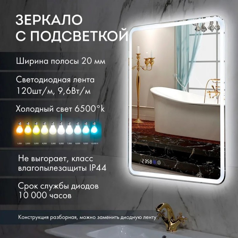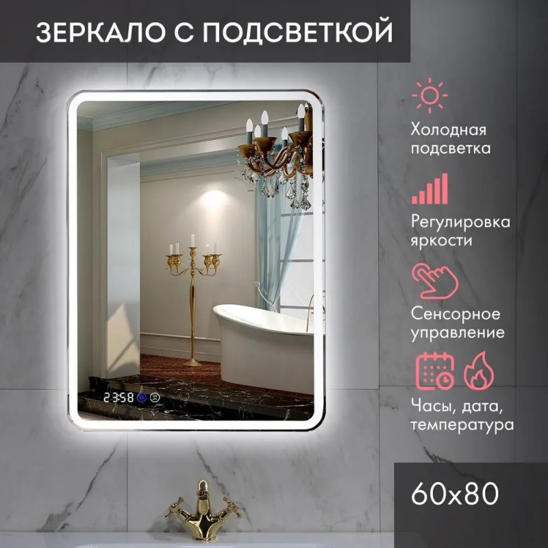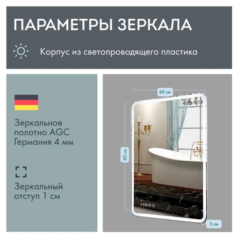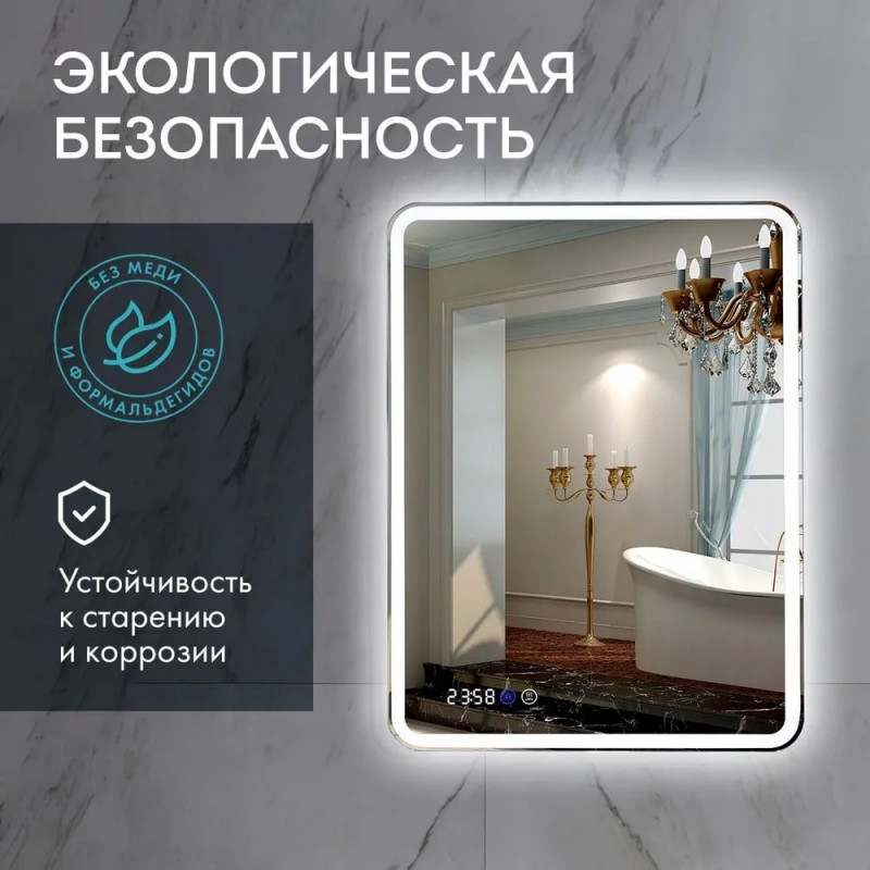 Без рамы, Встроенные часы, Встроенный термометр, Подсветка, Регулировка яркости подсветки, Антизапотевающее покрытие, Сенсорное управление